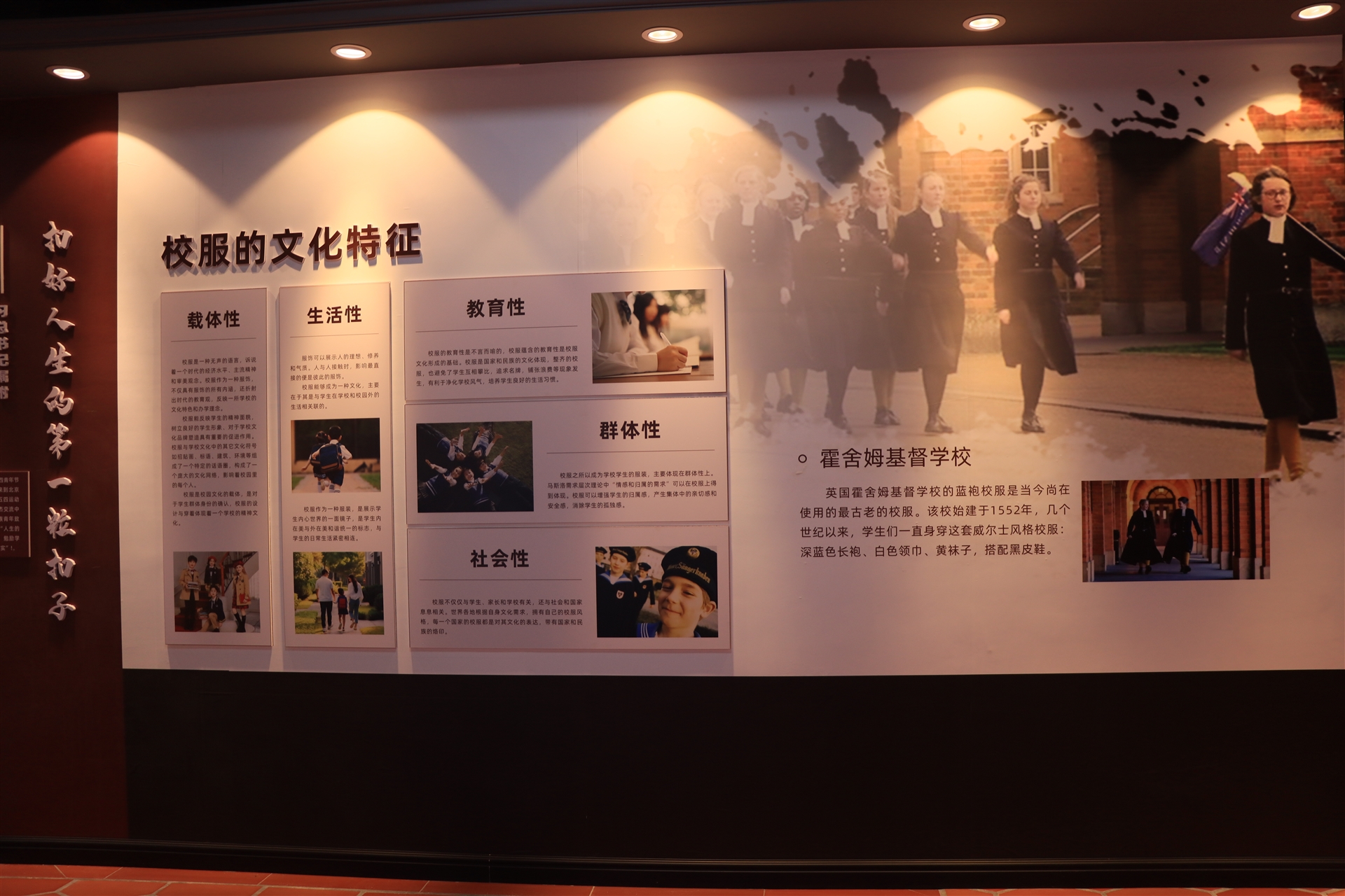 校服文化館通過(guò)圖文、實(shí)物、科技等形式,融合了場(chǎng)景、體驗互動(dòng),向大眾展示校服的歷史演變以及文化發(fā)展,未來(lái)與科技相結合的發(fā)展趨勢,從古老的校服文明,到現代校服發(fā)展,通過(guò)大量的實(shí)物展示讓大眾更直觀(guān)地感受到校服文化。開(kāi)啟一段校服文化之旅,領(lǐng)悟校服文化真諦。
