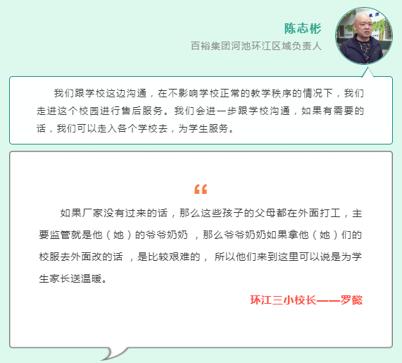 據了解,2017年6月百裕集團環(huán)江裕美扶貧車(chē)間成為環(huán)江中小學(xué)的校服供應商之一,同時(shí)也在環(huán)江縣城橋西路開(kāi)設了售后服務(wù)部針對校服不合身等問(wèn)題進(jìn)行售后服務(wù)。