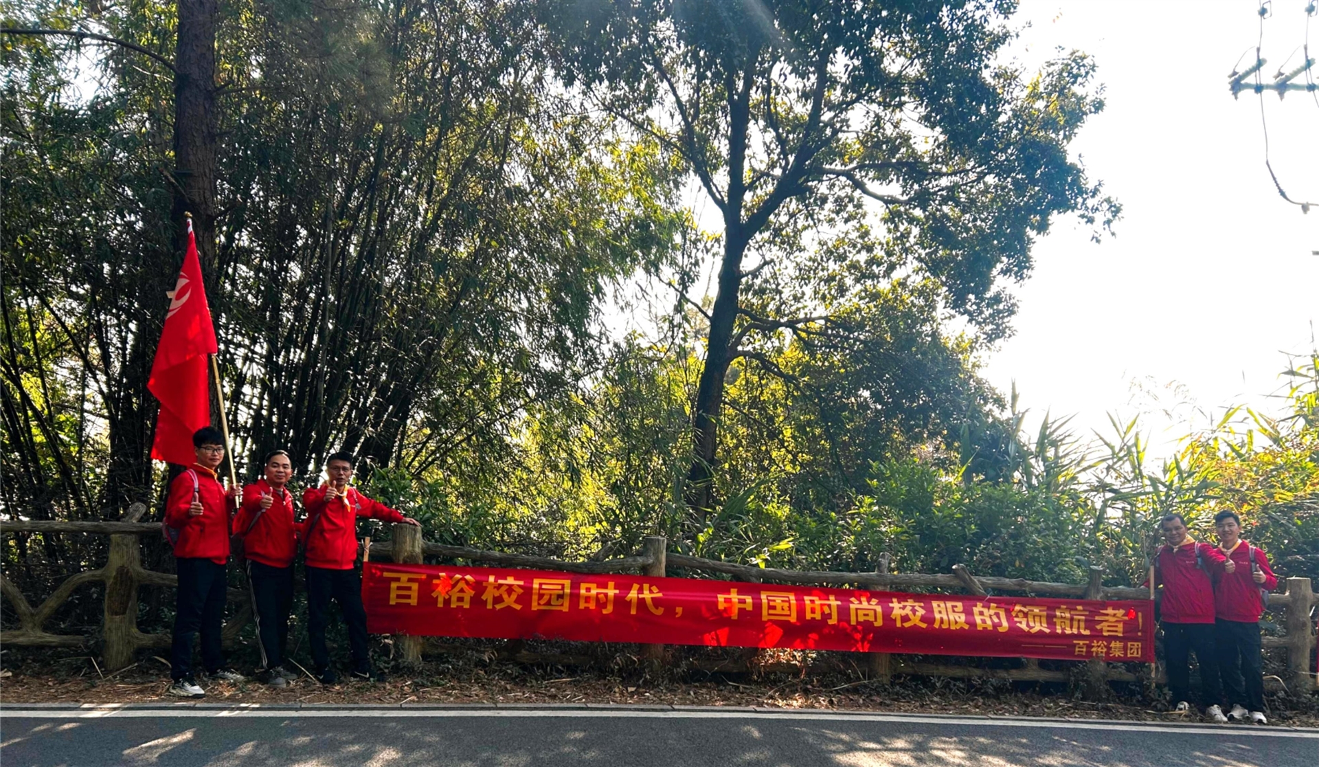 登山途中設有拍照打卡點(diǎn),企業(yè)團隊們紛紛在此駐足,擺出創(chuàng )意十足的姿勢,與美麗的山景和自家公司的橫幅合影。