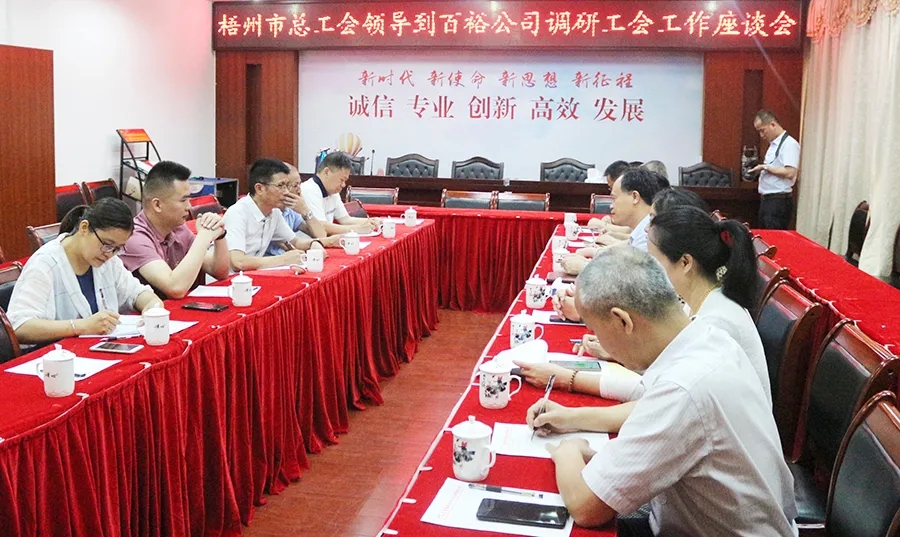 5月18日,梧州市總工會(huì )黨組書(shū)記、常務(wù)副主席謝善高、辦公室主任陳潔萍、勞經(jīng)部部長(cháng)呂星等領(lǐng)導蒞臨百裕調研指導,重點(diǎn)了解基層工會(huì )建設情況、運轉情況以及勞模創(chuàng )新工作等方面的工作情況。岑溪市人大副主任、工會(huì )主席謝梅、百裕世紀工會(huì )主席曾晏來(lái)陪同調研。