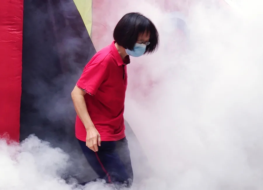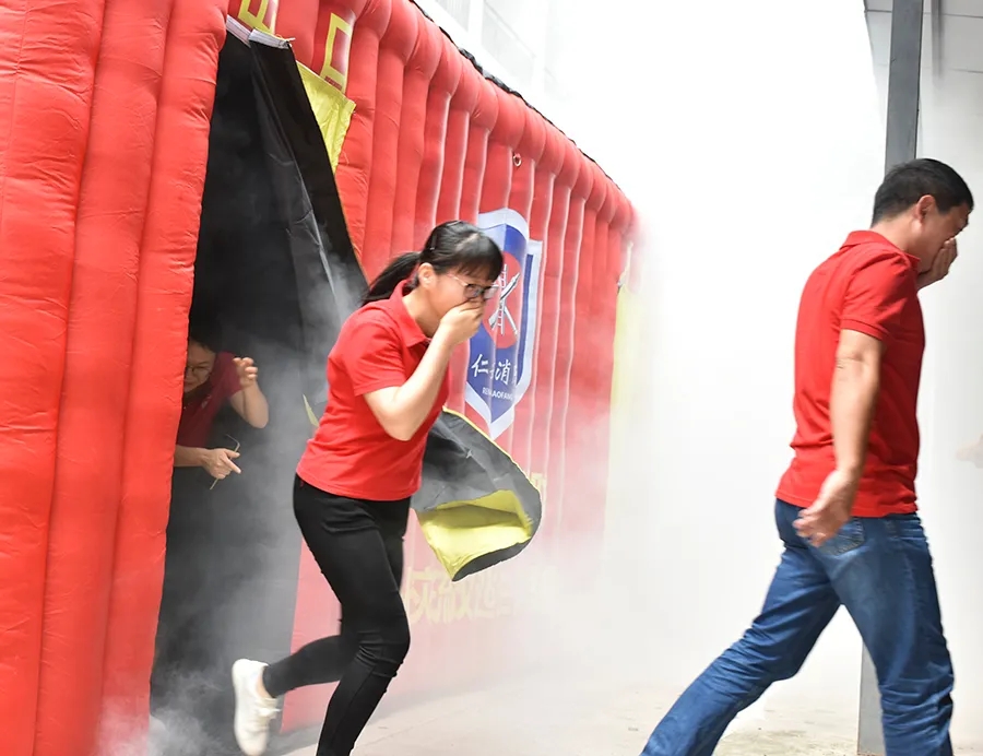 隨后,全體員工進(jìn)行了濃煙體驗應急逃生和滅火的綜合演練。緊急逃生模擬封閉場(chǎng)館火災情景,全體員工在密閉的環(huán)境下演練正確逃生方法。濃煙體驗小黑屋被遮得嚴嚴實(shí)實(shí),冒出陣陣濃煙,參與實(shí)訓的員工在徐教官的指導下,捂住口鼻,俯著(zhù)身,沿著(zhù)墻面,一一體驗了一把火場(chǎng)逃生的真實(shí)場(chǎng)景。