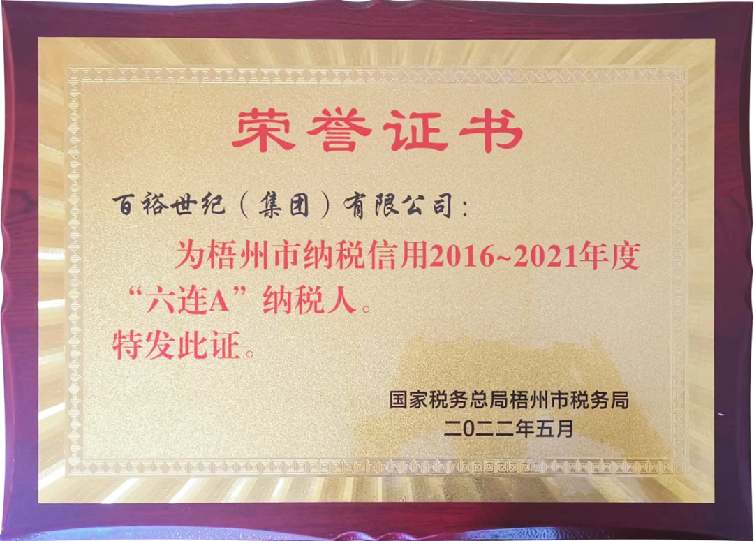 近日,經(jīng)國家稅務(wù)總局梧州市稅務(wù)局評審,百裕世紀(集團)有限公司被評為2016~2021年度“六連A”納稅人,這是我們堅持依法、誠信經(jīng)營(yíng)的實(shí)質(zhì)成果。