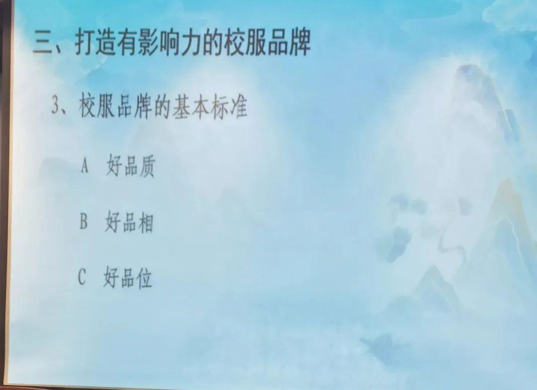 跟大家分享構建校服品牌高質(zhì)量發(fā)展的一些感悟:堅持、堅守、堅信、制造、創(chuàng )造、智造。