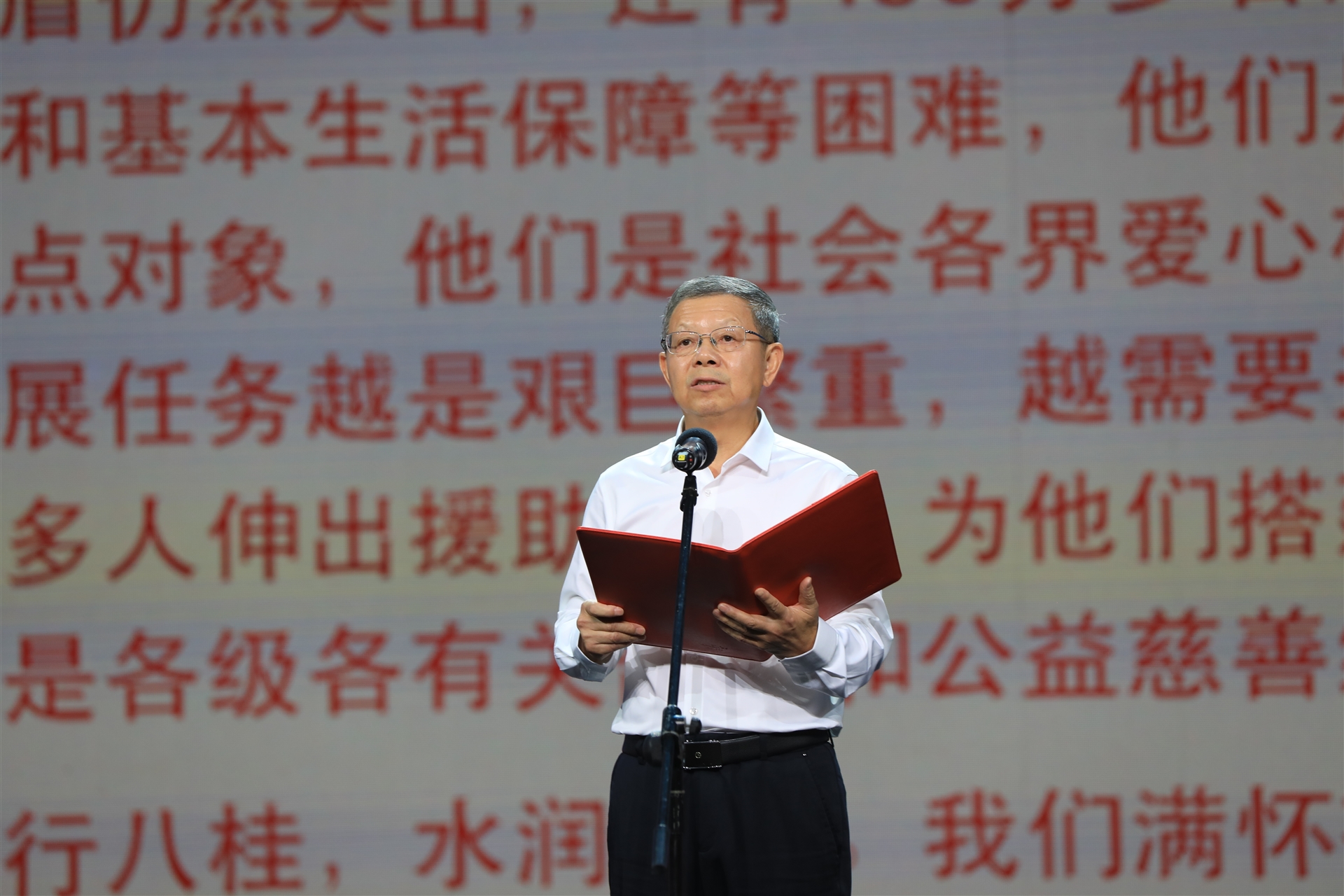 廣西慈善總會(huì )會(huì )長(cháng)、自治區政協(xié)第十一、十二屆原副主席劉正東宣讀慈善倡議書(shū)