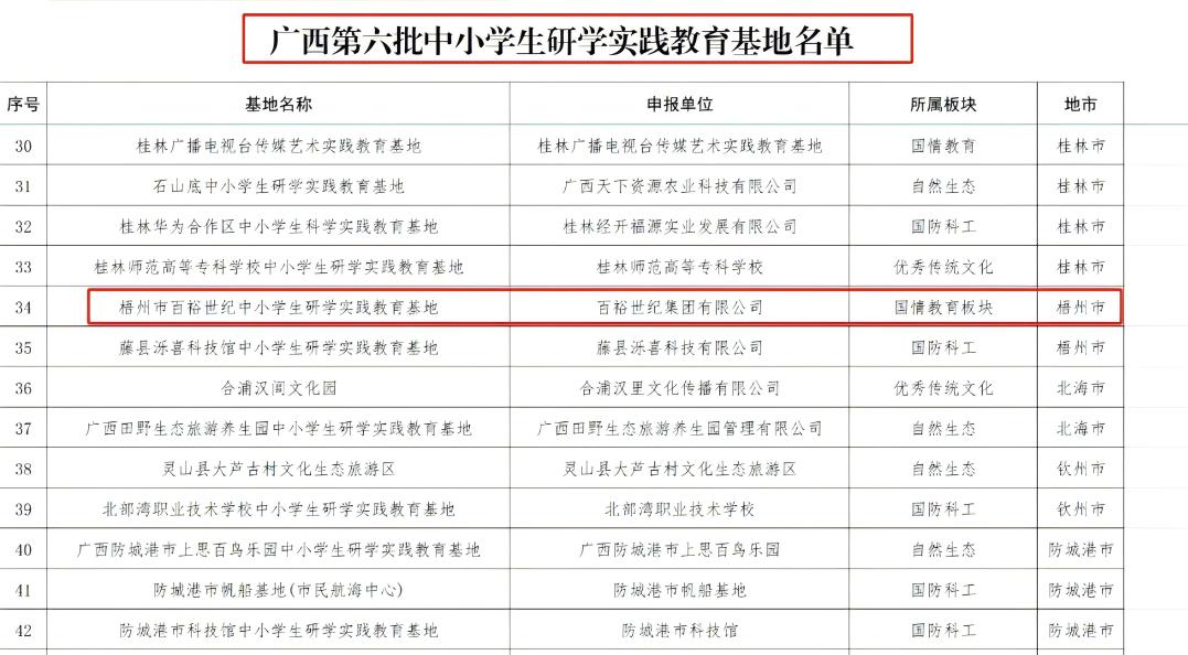 喜報丨百裕世紀(集團)入選廣西第六批中小學(xué)生研學(xué)實(shí)踐教育基地名單