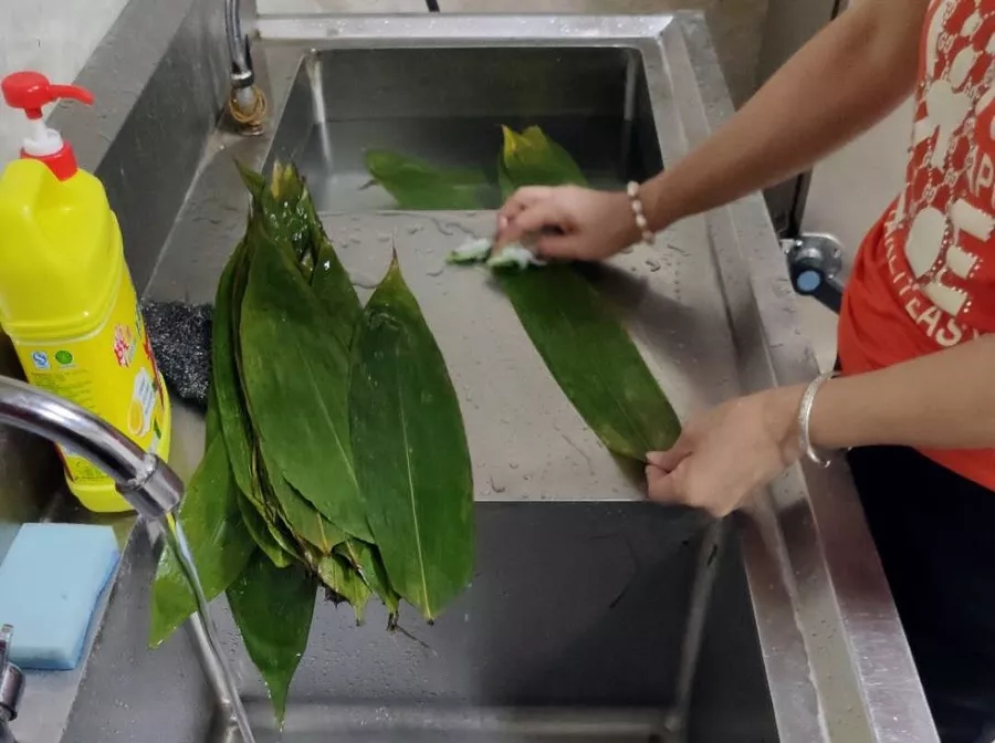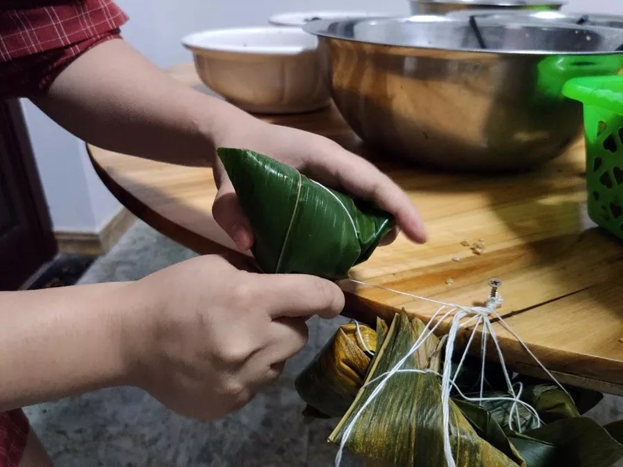 活動(dòng)現場(chǎng),員工們有的動(dòng)作麻利優(yōu)美,卷葉-填料-打結.....,轉眼間就包出了一個(gè)棱角分明的粽子;有的因為沒(méi)有經(jīng)驗,繩子還沒(méi)來(lái)得及捆,粽子葉就散了,糯米灑了一桌。