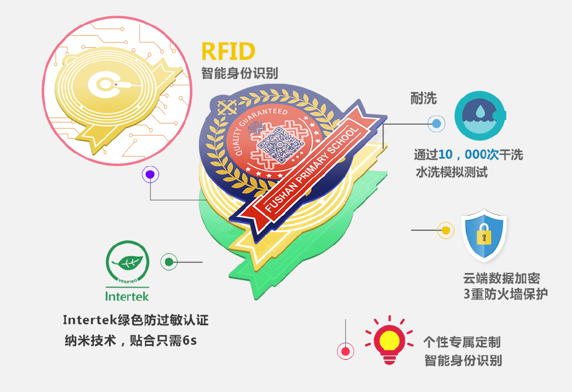這兩塊標識分別是RFID智能傳感芯片和智能二維碼?;?它們有效提升了校服的科技感。