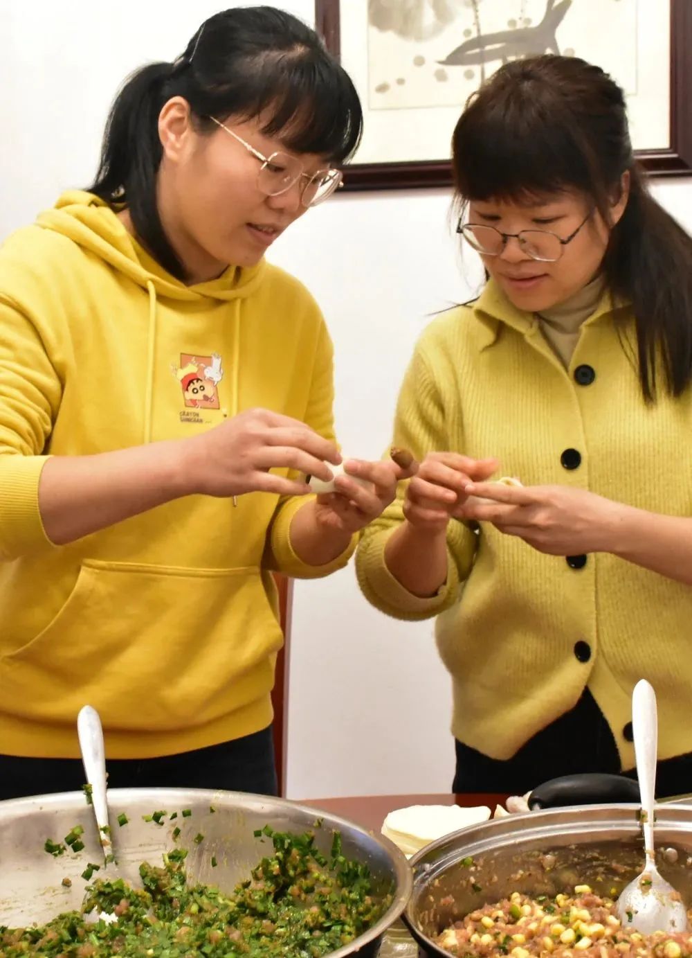 新春伊始,大家齊聚餐廳各顯神通,放餡、捏皮,完整連貫。一會(huì )兒功夫,一盤(pán)盤(pán)大小勻稱(chēng)、緊實(shí)飽滿(mǎn)、形狀美觀(guān)的餃子整齊地擺上了臺面:月牙狀、元寶狀、柳葉狀等各式各樣的餃子組成了一桌餃子“全家?!?,堪比精美花朵百花齊放。