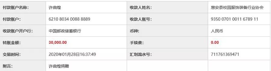 許曲煌董事長(cháng)作為惠安校園服飾裝備行業(yè)協(xié)會(huì )會(huì )長(cháng),牽頭組織惠安校服協(xié)會(huì )共有132名會(huì )員企業(yè)家、群友,通過(guò)協(xié)會(huì )賬戶(hù)主渠道捐資520500元,通過(guò)其他渠道捐款的數額也將近20萬(wàn)元。協(xié)會(huì )所募抗疫捐資,已轉40萬(wàn)元到惠安縣慈善總會(huì )戶(hù)頭。其余的,根據有關(guān)部門(mén)意見(jiàn),留待購買(mǎi)應急防控醫用物品,或隨時(shí)聽(tīng)候縣防控指揮部調用。目前,后續的捐款還在進(jìn)行中。