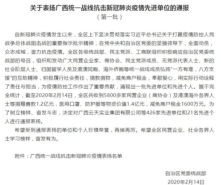 2月14日,自治區黨委統戰部表?yè)P447個(gè)抗疫先進(jìn)單位(個(gè)人),百裕集團在這次新冠肺炎病毒疫情愛(ài)心公益行動(dòng)中,積極擔當作為,認真履行企業(yè)應盡的社會(huì )責任,捐款、捐物等公益表現得到了自治區統戰部的表?yè)P,我們將珍惜榮譽(yù),再接再厲,為打贏(yíng)防控狙擊戰做出貢獻。