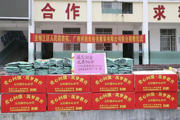 此次活動(dòng),金城江區人民檢察院為五圩鎮中心小學(xué)捐贈共計價(jià)值8000余元的400套學(xué)生文具,百裕集團為五圩鎮中心小學(xué)捐贈共計377套價(jià)值33930元學(xué)生校服。